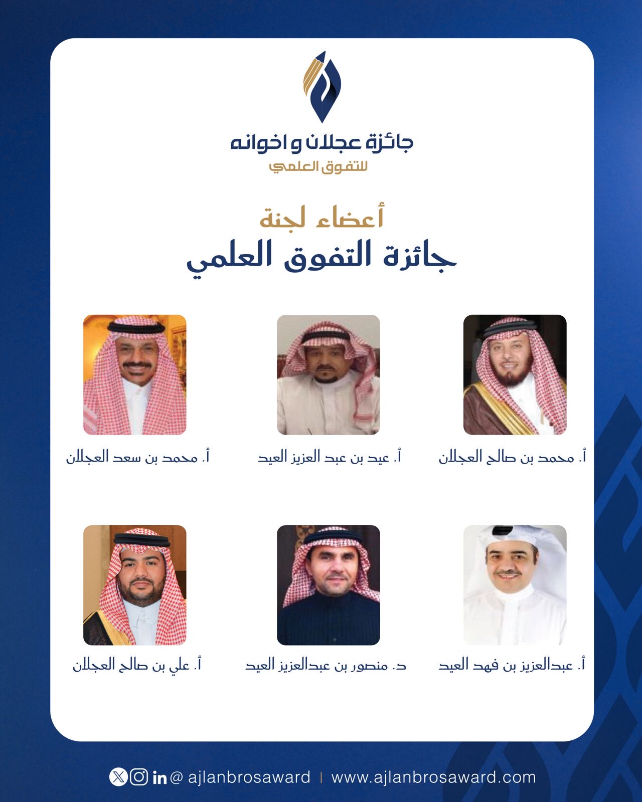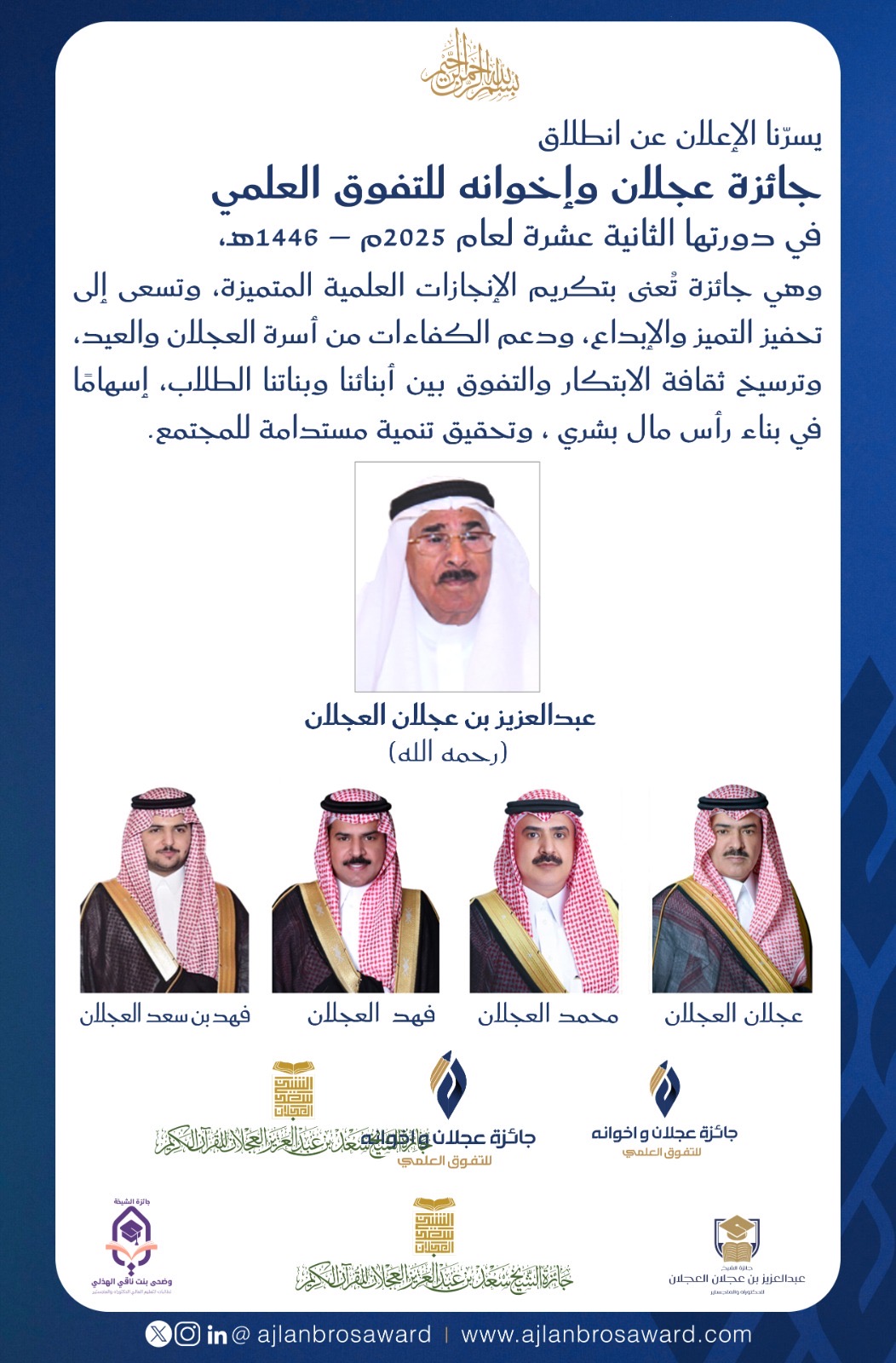 امتدادًا لما توليه القيادة الرشيدة – أيدها الله – من اهتمام بالتعليم ودعم مسارات التميز وبناء الإنسان، يسرّنا الإعلان عن إنطلاق جائزة عجلان وإخوانه للتفوق العلمي في دورتها الثانية عشرة لعام 2025م – 1446هـ.