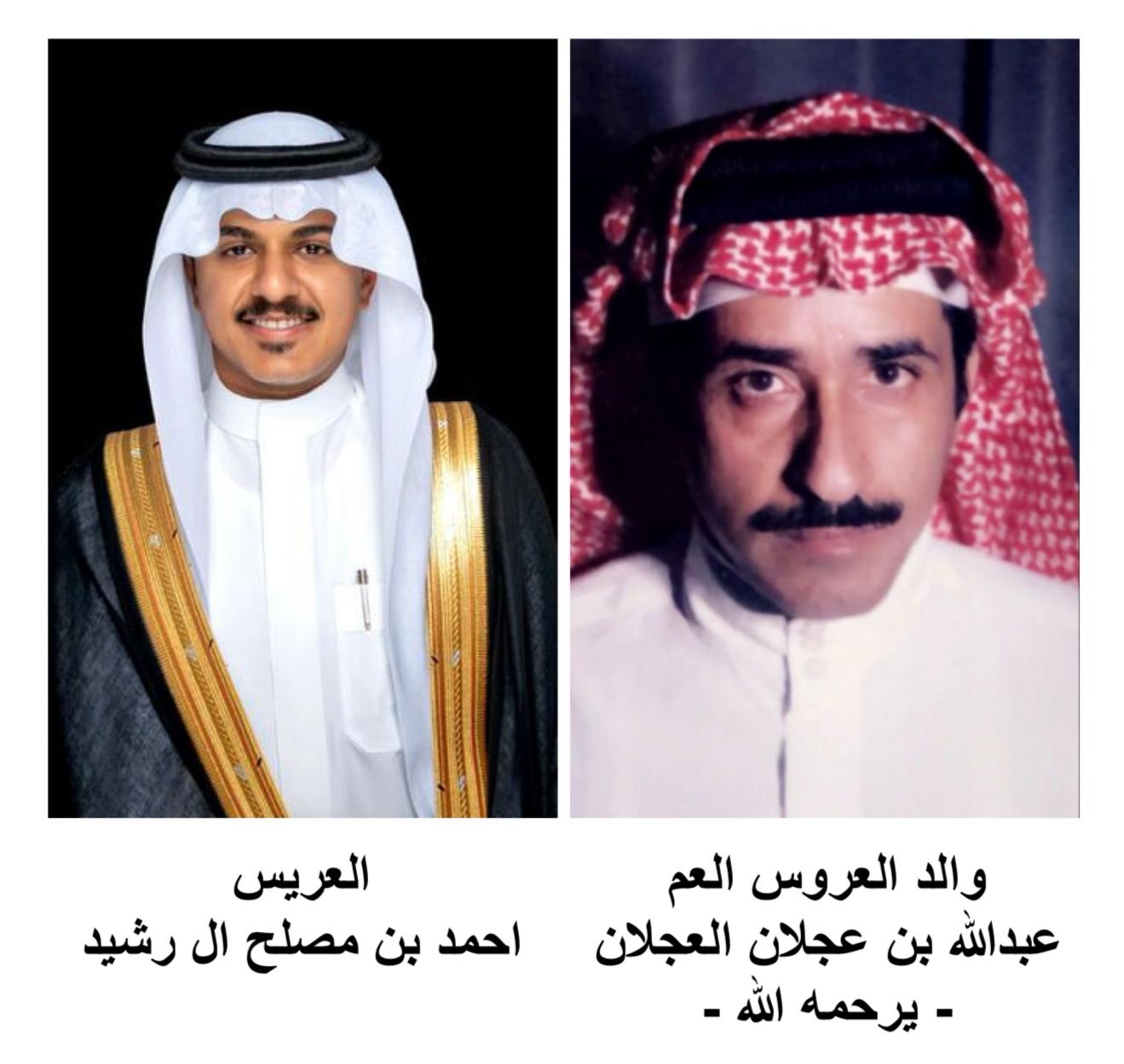 يتشرف أبناء مصلح بن مصلح ال رشيد -يرحمه الله- وأبناء العم عبدالله بن عجلان العجلان -يرحمه الله- بدعوتكم لحضور حفل الزواج وتناول طعام العشاء بمناسبة زواج الشاب (احمد بن مصلح ال رشيد) على كريمة عبدالله بن عجلان العجلان وذلك بمشيئة الله تعالى مساء يوم الثلاثاء 1447/08/01ﮪ الموافق 2026/01/20م في نادي منسوبي وزارة الداخلية (قاعة نجد)، والدعوة عامة لجميع أفراد الأسرة.