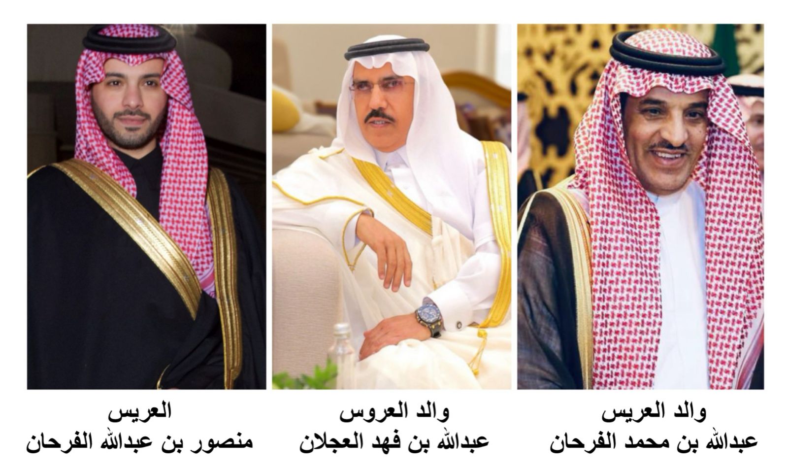 يتشرف عبدالله بن محمد بن عبدالرحمن الفرحان و عبدالله بن فهد بن عبدالعزيز العجلان بدعوتكم لحضور حفل الزواج وتناول طعام العشاء بمناسبة زواج الابن المهندس (منصور بن عبدالله الفرحان) على كريمة عبدالله بن فهد العجلان وذلك بمشيئة الله تعالى مساء يوم السبت ١٤٤٧/١٠/٢٣ﮪ الموافق ٢٠٢٦/٠٤/١١م في فندق الانتركونتيننتال- القاعة الرئيسية (بوابة 2)، والدعوة عامة لجميع أفراد الأسرة.