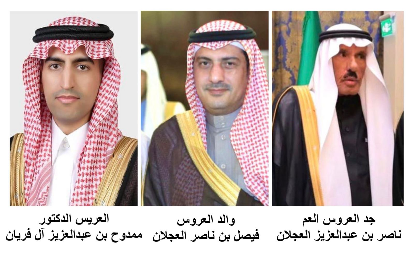 يتشرف الشيخ عبدالعزيز بن صالح بن عبدالعزيز آل فريان والشيخ ناصر بن عبدالعزيز بن ناصر العجلان بدعوتكم لحضور حفل عشاء الذي سيقام بمناسبة زواج الإبن د.ممدوح بن عبدالعزيز بن صالح آل فريان على كريمة فيصل بن ناصر بن عبدالعزيز العجلان وذلك -بمشيئة الله تعالى- مساء يوم الخميس 1447/11/06ﮪ الموافق 2026/4/23م بفندق الريتز كارلتون بمدينة الرياض، والدعوة عامة لجميع أفراد الأسرة.
